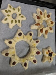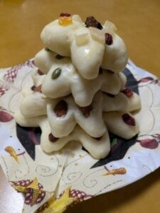 みんなでこねて、生地を寝かせました。寝かせた生地を更にこねて、ツリーのパーツにドライフルーツやナッツを飾りオーブンで焼いて、パーツを組み合わせると完成です!!