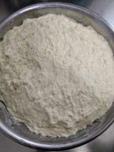 昔、参加した子育てサロンのパン作りを思い出しながら…小麦粉に砂糖と塩、牛乳と水にドライイーストを混ぜて、こねこね…まるで粘土遊びみたいで、「わたしもやる〜」「ぼくも〜」と狭いキッチンに子どもたちが乱入!!